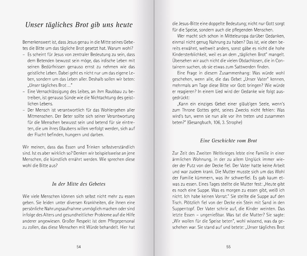 „Es muss ein erhebender Augenblick gewesen sein, als Jesus seine Jünger das Vaterunser gelehrt hat! Was mögen die Jünger gefühlt haben, als er es das erste Mal gebetet hat? Niemand weiß, welche Auswirkungen dieses Gebet hat, das seit zwei Jahrtausenden von gläubigen Menschen in den unterschiedlichsten Lebenssituationen gesprochen wird. […]“