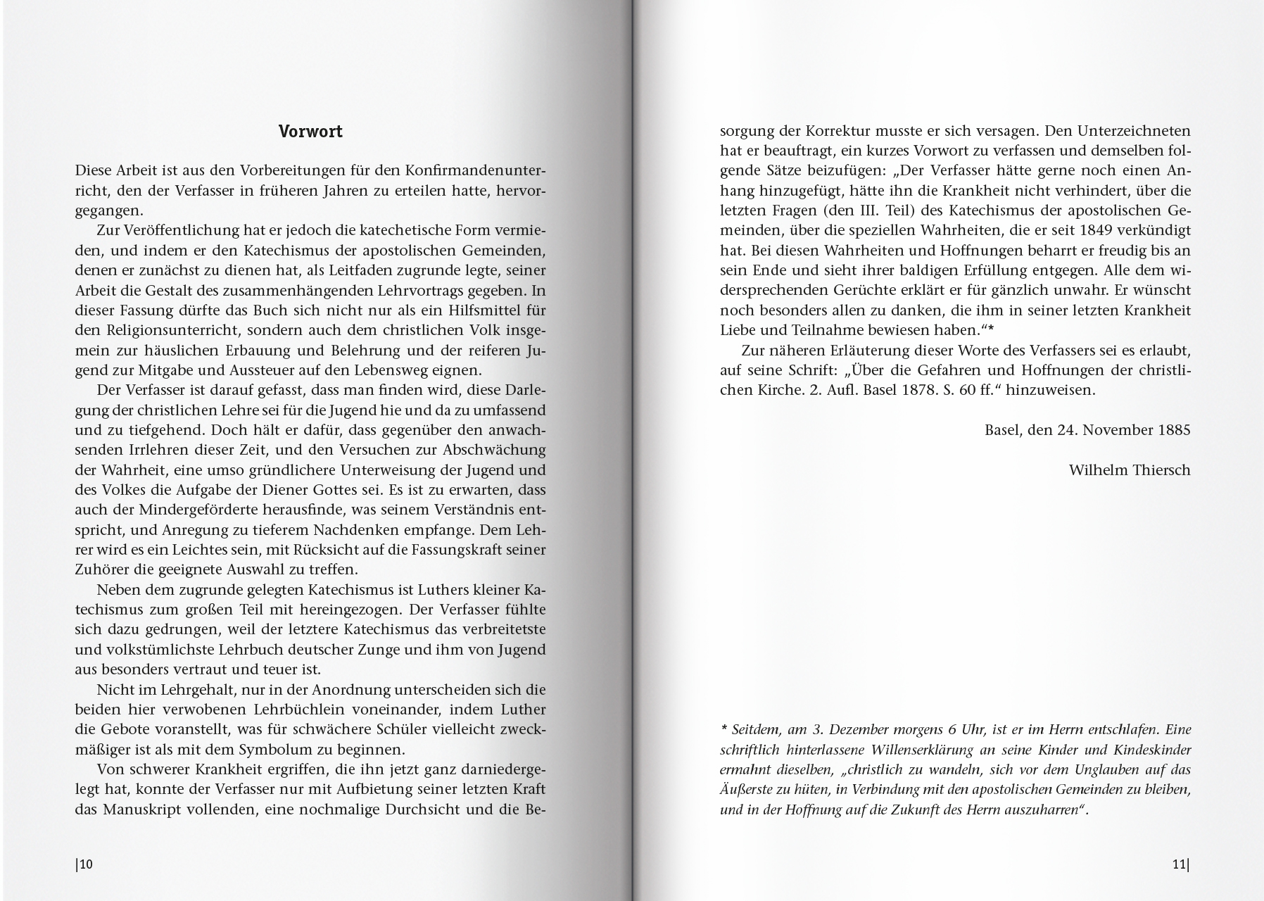 In katholisch-apostolischen Kreisen gilt Heinrich Wilhelm Josias Thiersch als „herausragender Schriftsteller innerhalb des apostolischen Werkes“ (Karl Born). Sein letztes Buch „Inbegriff der christlichen Lehre“ kann als Abschluss seines Lebenswerks betrachtet werden. Obwohl als Kompendium der christlichen Lehre und Hilfsmittel für den Religionsunterricht konzipiert, trägt das Werk in weiten Teilen den Charakter eines persönlichen Glaubensbekenntnisses. Neben den Erläuterungen zu den Glaubensbekenntnissen und den Geboten zählen für Thiersch zu den „fünf Hauptstücken“ christlicher Lehre das Vaterunser, die Taufe und das Abendmahl. An dieser Struktur wird deutlich, dass für Thierschs „Inbegriff der christlichen Lehre“ Luthers kleiner Katechismus Pate gestanden hatte. Noch vor Drucklegung des Buches 1885 verstarb der Verfasser.