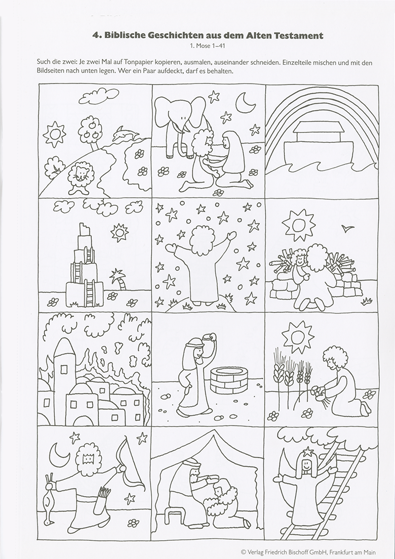 Eine der besten Möglichkeiten, Kindern biblische Themen spielerisch zugänglich zu machen, sind Bibelgeschichten. Unser Heft mit 30 leicht heraustrennbaren Kopiervorlagen enthält viele Anregungen zum Basteln, Malen und Spielen rund um biblische Geschichten:
