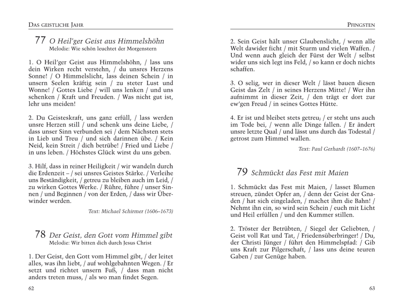 Der Hauptabschnitt "Das geistliche Jahr" folgt dem Ablauf des Kirchenjahrs. Im Hauptabschnitt "Gottesdienst" folgen die Lieder dem gottesdienstlichen Ablauf und seinen liturgischen Elementen. Er ist mit 185 Liedern der umfangreichste Teil des Gesangbuchs. Die Rubrik "Sakramente" ist dreigeteilt (Heilige Taufe, Heiliges Abendmahl, Heilige Versiegelung). Der Abschnitt "Segenshandlungen" gliedert sich in Konfirmation und Trauung. Die Lieder des Abschnitts "Den Glauben leben" eignen sich für den Gottesdienst, begleiten den Einzelnen aber auch in seinem persönlichen Alltag.