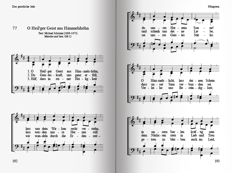 Der Hauptabschnitt "Das geistliche Jahr" folgt dem Ablauf des Kirchenjahrs. Im Hauptabschnitt "Gottesdienst" folgen die Lieder dem gottesdienstlichen Ablauf und seinen liturgischen Elementen. Er ist mit 185 Liedern der umfangreichste Teil des Gesangbuchs. Die Rubrik "Sakramente" ist dreigeteilt (Heilige Taufe, Heiliges Abendmahl, Heilige Versiegelung). Der Abschnitt "Segenshandlungen" gliedert sich in Konfirmation und Trauung. Die Lieder des Abschnitts "Den Glauben leben" eignen sich für den Gottesdienst, begleiten den Einzelnen aber auch in seinem persönlichen Alltag.