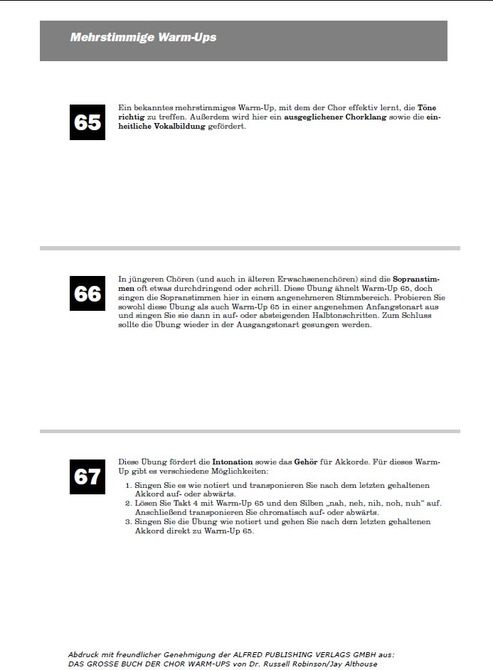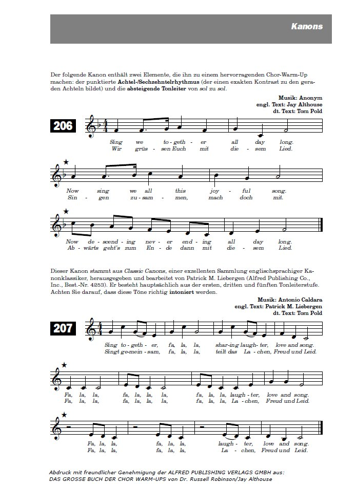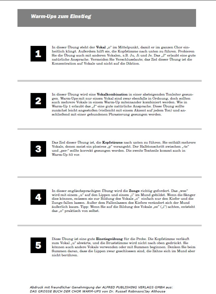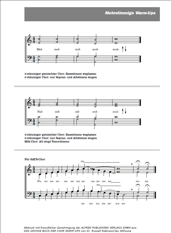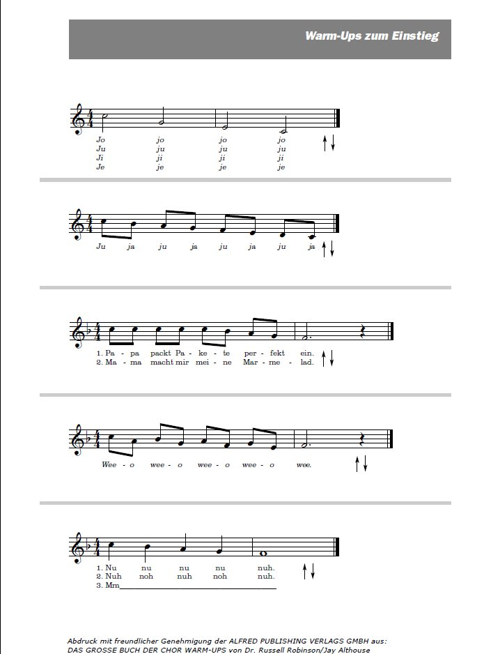 Mehr als 200 Übungsideen zum Einsingen, Aufwärmen und zur Stimmbildung. Mit Praxisanleitung: Gymnastische Übungen, Einstiegs- und Übergangsübungen für eine erfolgreiche Chorprobe, mehrstimmige Warm-Ups für einen geschlossenen Gesamtklang, Intervallübungen zur Entwicklung stimmlicher Sicherheit, spezielle Jazz/Pop/Swing-Warm-Ups zur Vorbereitung zeitgemäßer Chorliteratur, spezielle Aufwärmübungen für Kirchenchöre sowie Kanons zum gemeinsamen Singen.